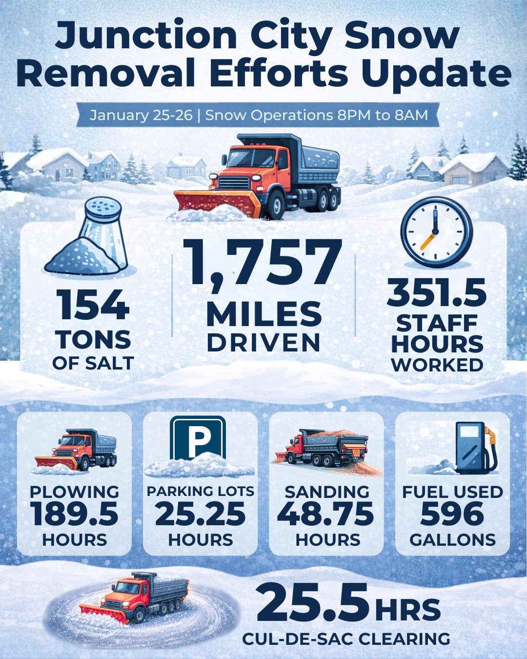 Here’s our most up-to-date snow removal update as of 11:00 PM on January 25th. Our Public Works and Parks & Rec crews continue working 12 hour shifts to keep Junction City moving safely.