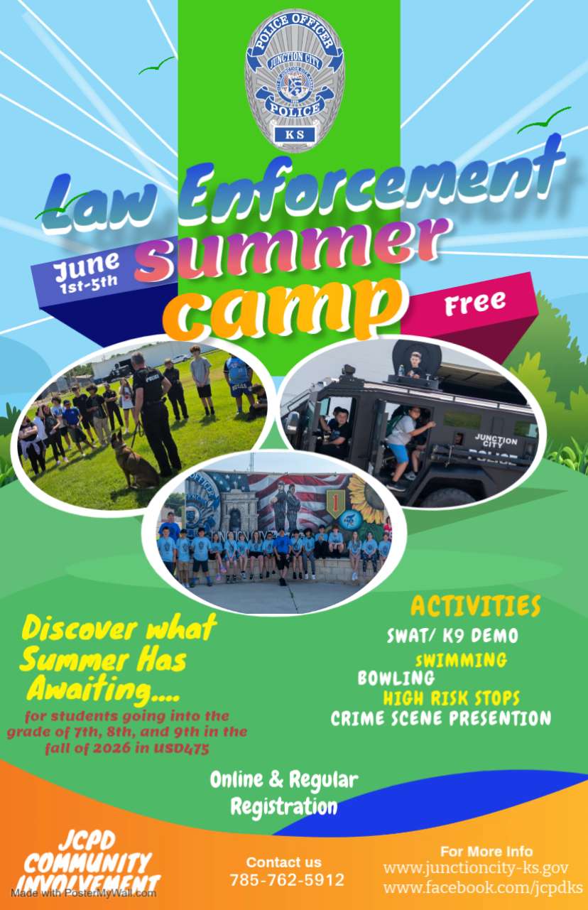 The Junction City Police Department Community Involvement Unit is currently accepting applications for the 2026 Law Enforcement Summer Camp, June 1st through 5th, 2026 (see below for more details).