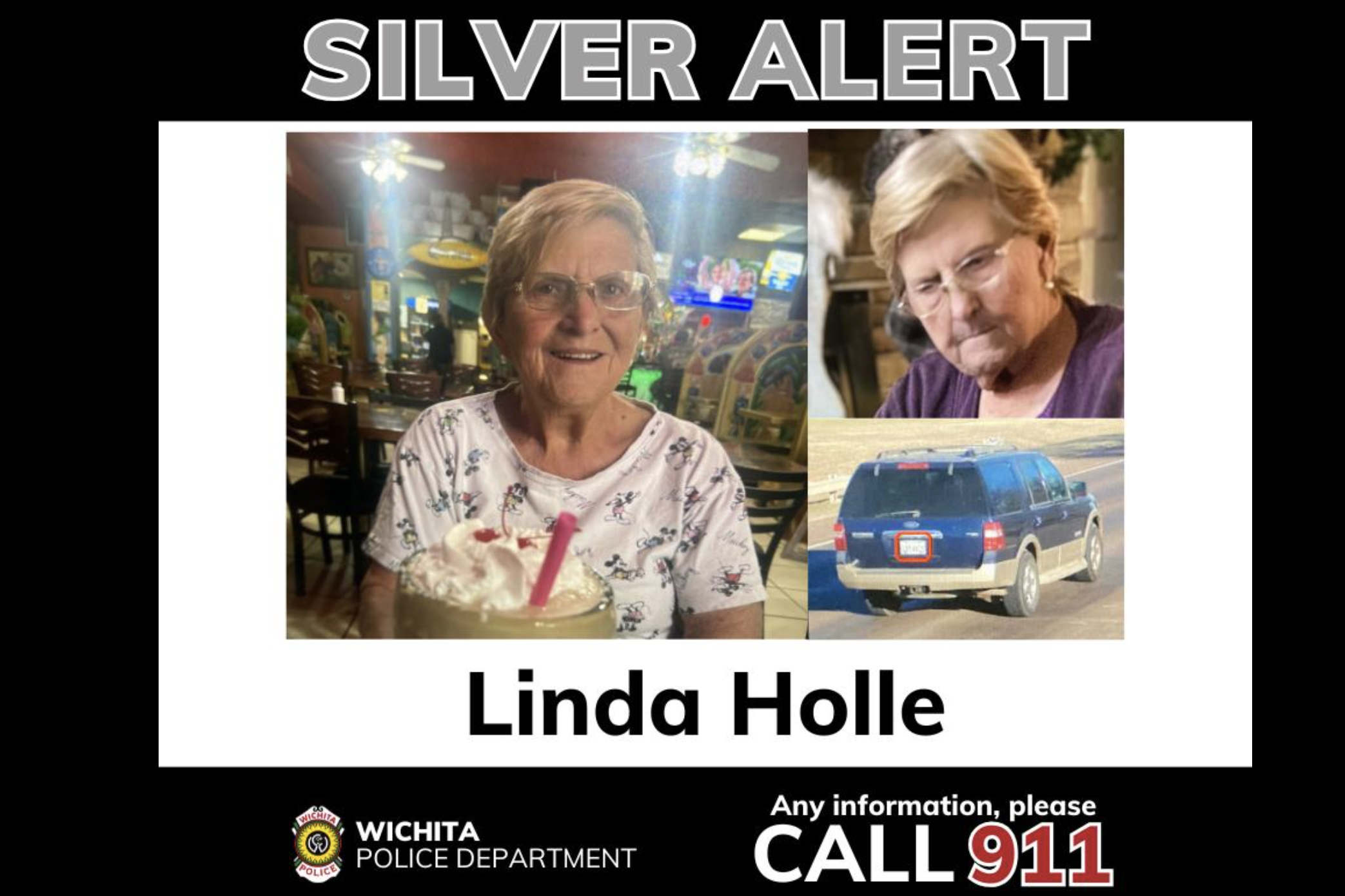 If you see Holle, or her vehicle, please call 911 immediately. If you have other information about her whereabouts, please call the Wichita Police Department at (316) 268-4111.