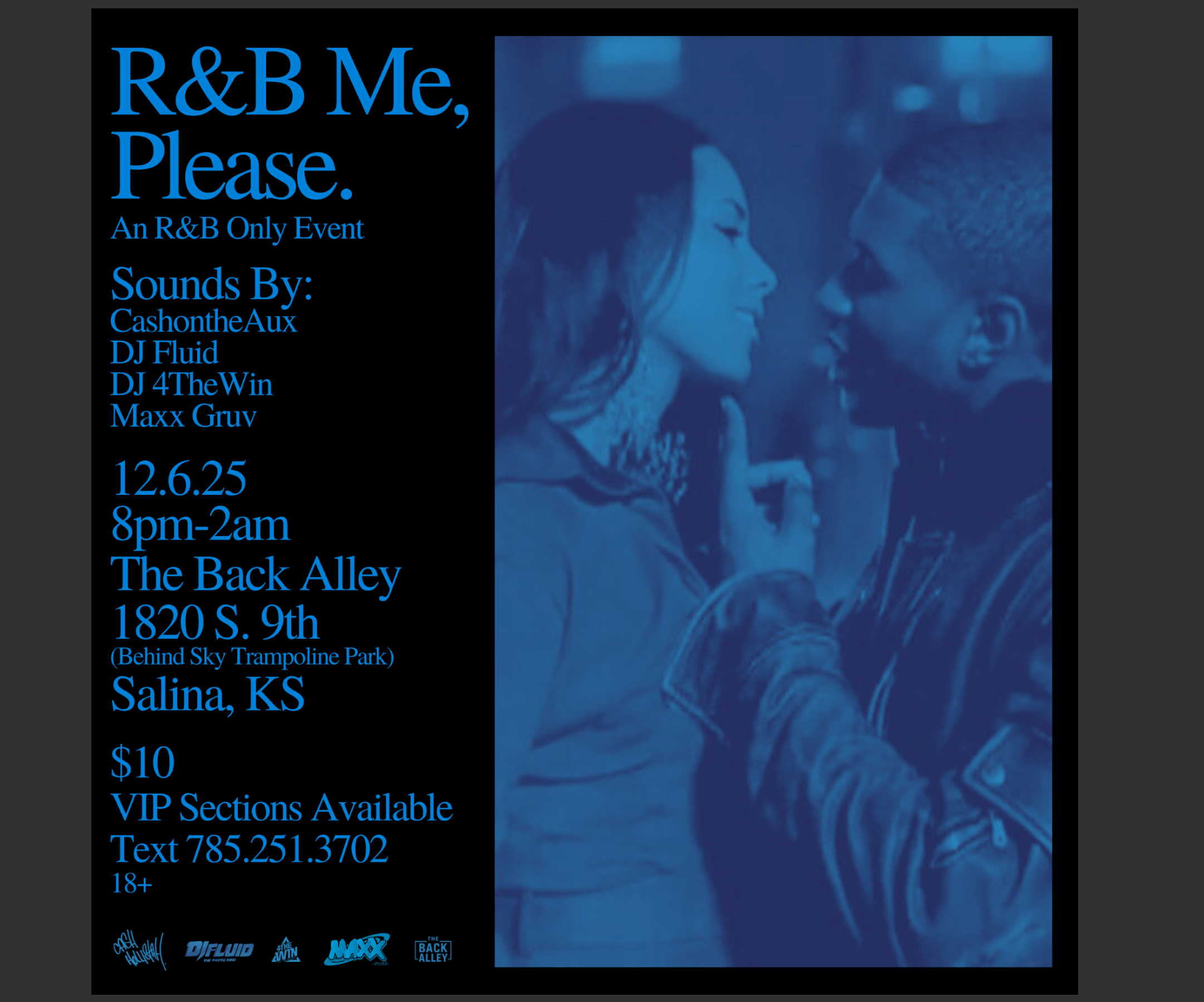 Salina’s nightlife will get a smooth, soulful boost this weekend as “R&B Me, Please”—an R&B-only party—takes over The Back Alley on Saturday, December 6, from 8 pm to 2 am.