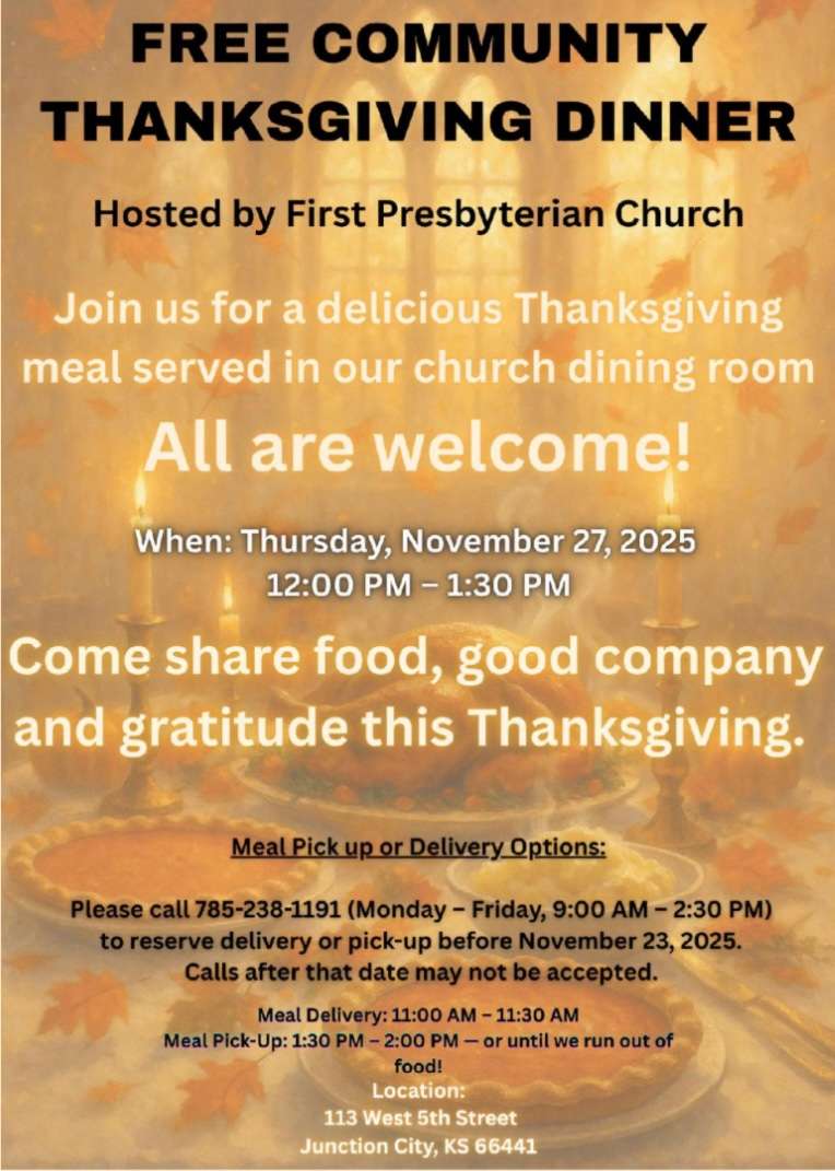 1. The First Presbyterian Church in Junction City is hosting a Thanksgiving Day Meal today from 12:00-1:30 p.m. at their church - 113 W. 5th Street, in Junction City. (The Thanksgiving Meal Flyer is posted below.)