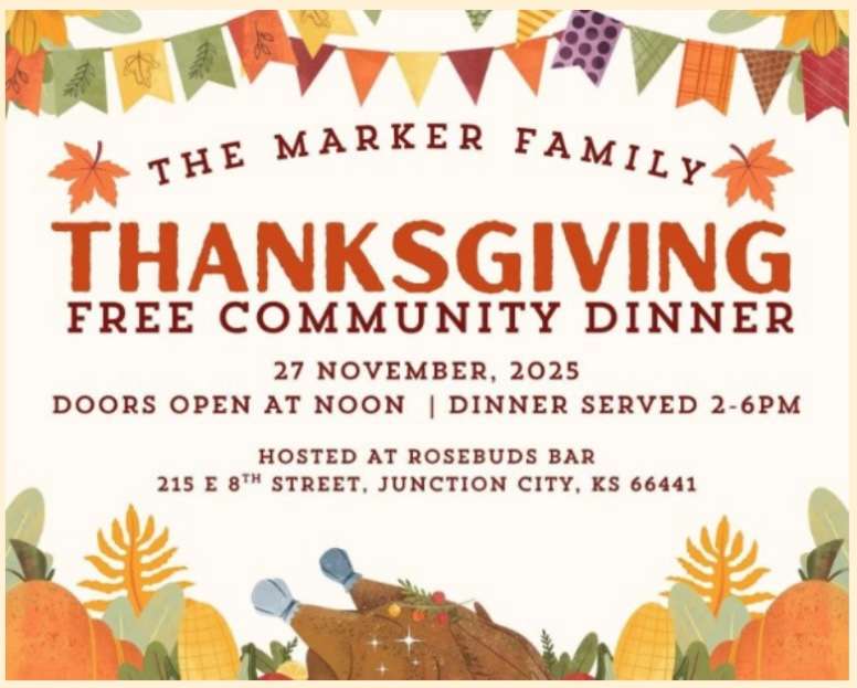 2. The Marker Family is hosting a Free Community Thanksgiving Dinner at Rosebud's Bar in Junction City. The address is 215 East 8th Street, in Junction City. Doors open at Noon, and dinner will be served from 2:00-6:00 P.M. (The Thanksgiving Meal flyer is posted below.)