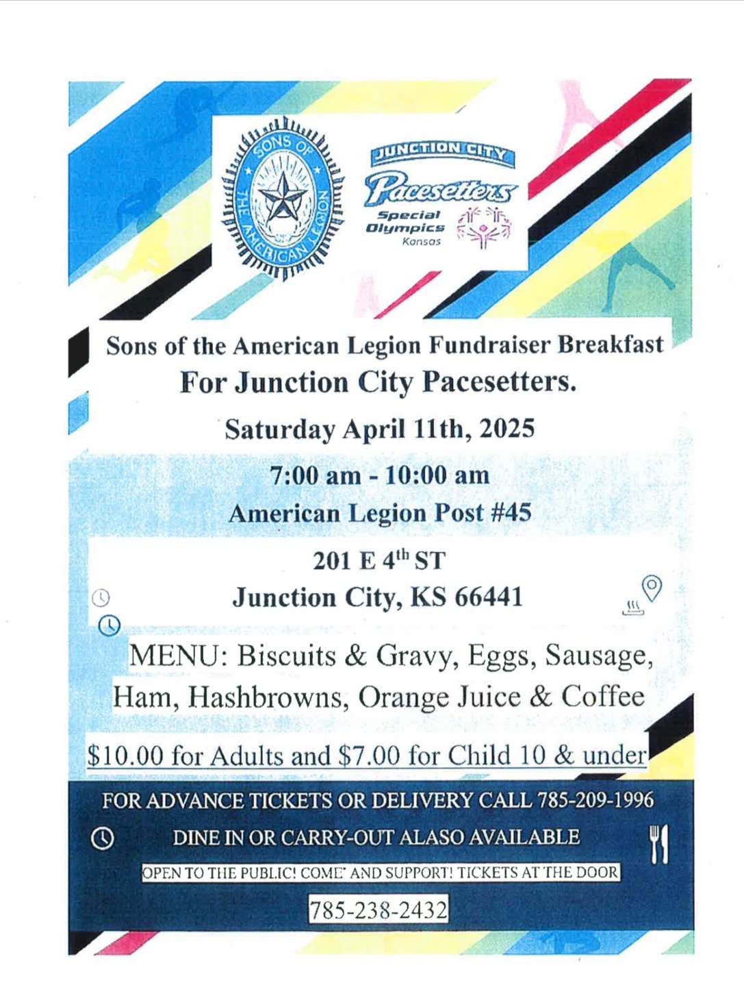 JUNCTION CITY, KS — The Sons of the American Legion will host a community fundraiser breakfast to support the Junction City Pacesetters Special Olympics program this Saturday, April 11, from 7:00 a.m. to 10:00 a.m.