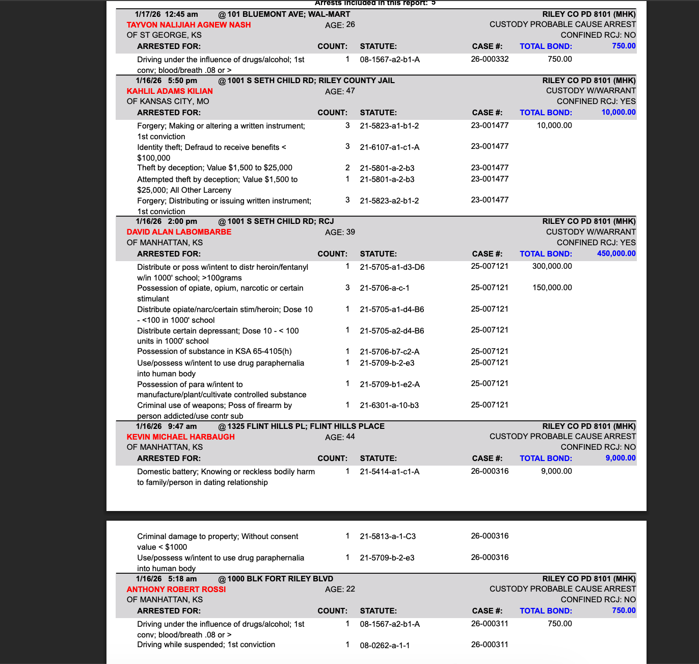 The following is a summary of arrests, citations by the Riley County Police Department. Those arrested are presumed innocent until proven guilty in a court of law.