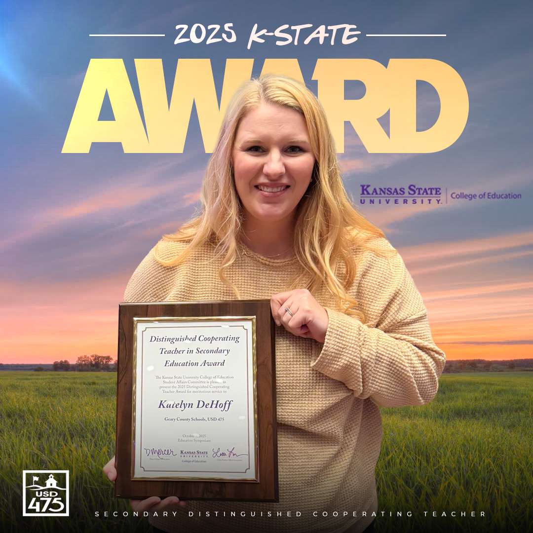 JUNCTION CITY, Kan. - Junction City High School teacher Katie DeHoff was named the 2025 K-State College of Education Secondary Distinguished Cooperating Teacher honoree at the Kansas State University Fall Education Symposium.