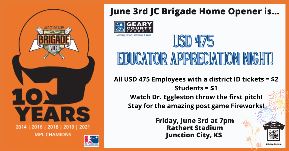 USD 475 Education Appreciation Night will be held Friday, June 3rd, at the Junction City Brigade home opener at Rathert Field. All USD 475 employees with a District ID can get tickets for $2 and students for $1.