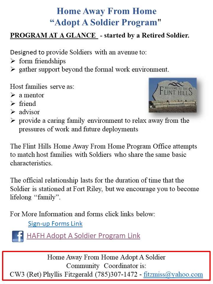 Flint Hills Home Away from Home Program provides select community leaders an opportunity to provide Soldiers a home-away-from-home during their first enlistment. It gives the community members an opportunity to meet young men and women from Fort Riley.